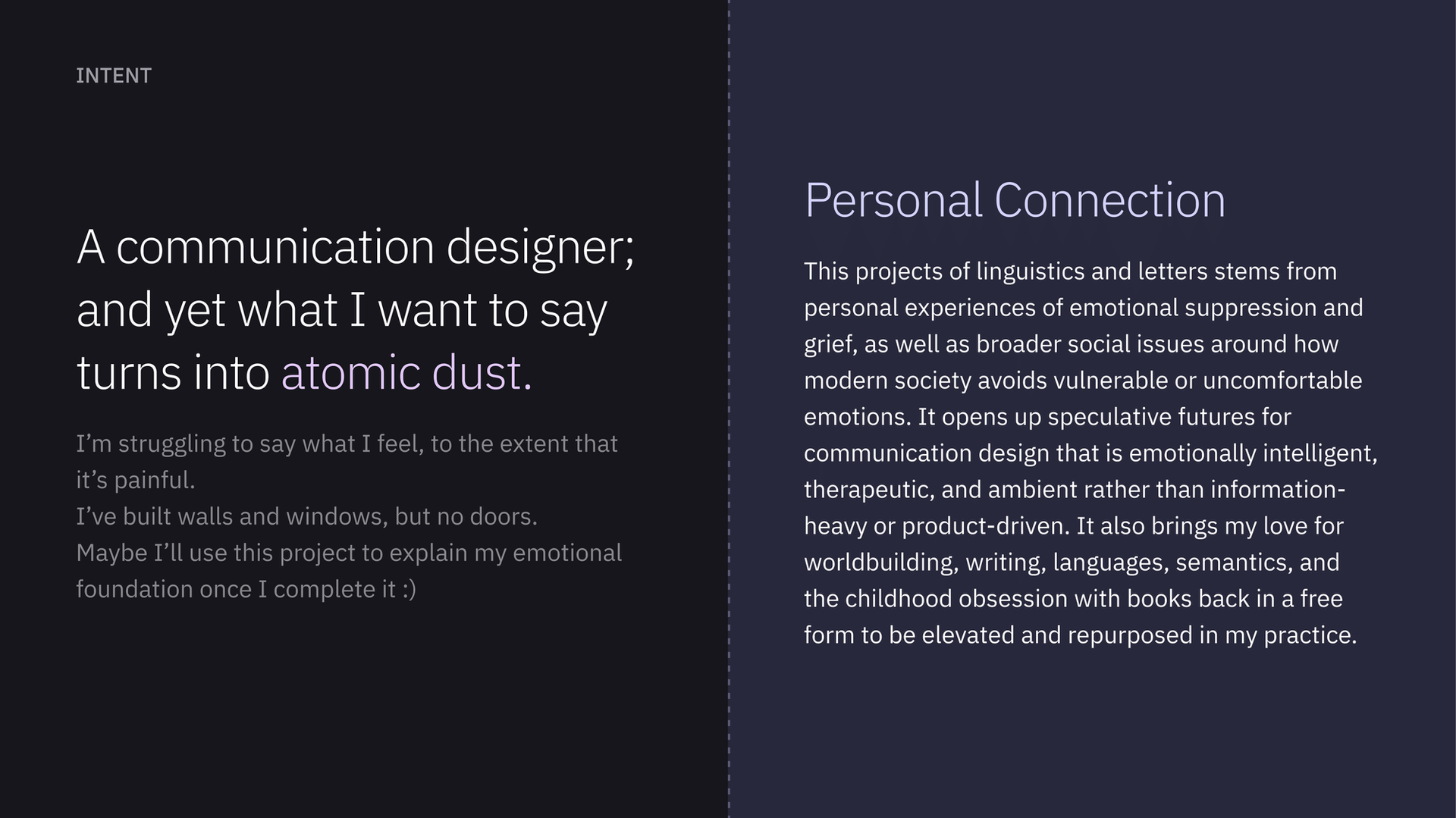 This work draws from my own lived experiences with emotional expression, my technical and visual design practice, and an ambition to build creative tools that care- inviting users to reflect, connect, and begin to see language differently.